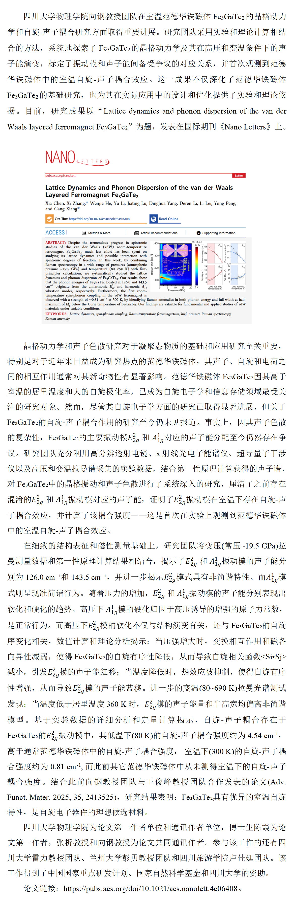 437bwin必赢国际向钢教授团队首次观测到范德华铁磁体中的室温自旋-声子耦合效应